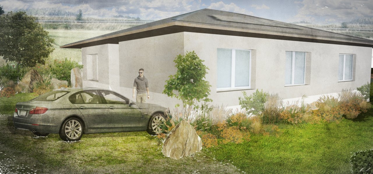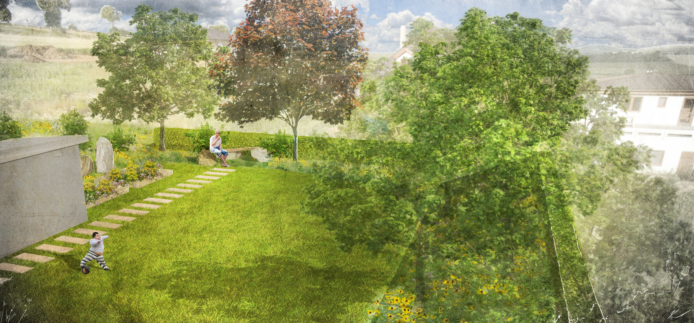 Zahrada je situována na jižním svahu s výhledem dolů do údolí. Naším cílem bylo zejména vypořádat se se sklonem terénu a vytvoření dostatečného pobytového prostoru na relativně malém pozemku. Tady vznikla myšlenka využít lokální kámen.