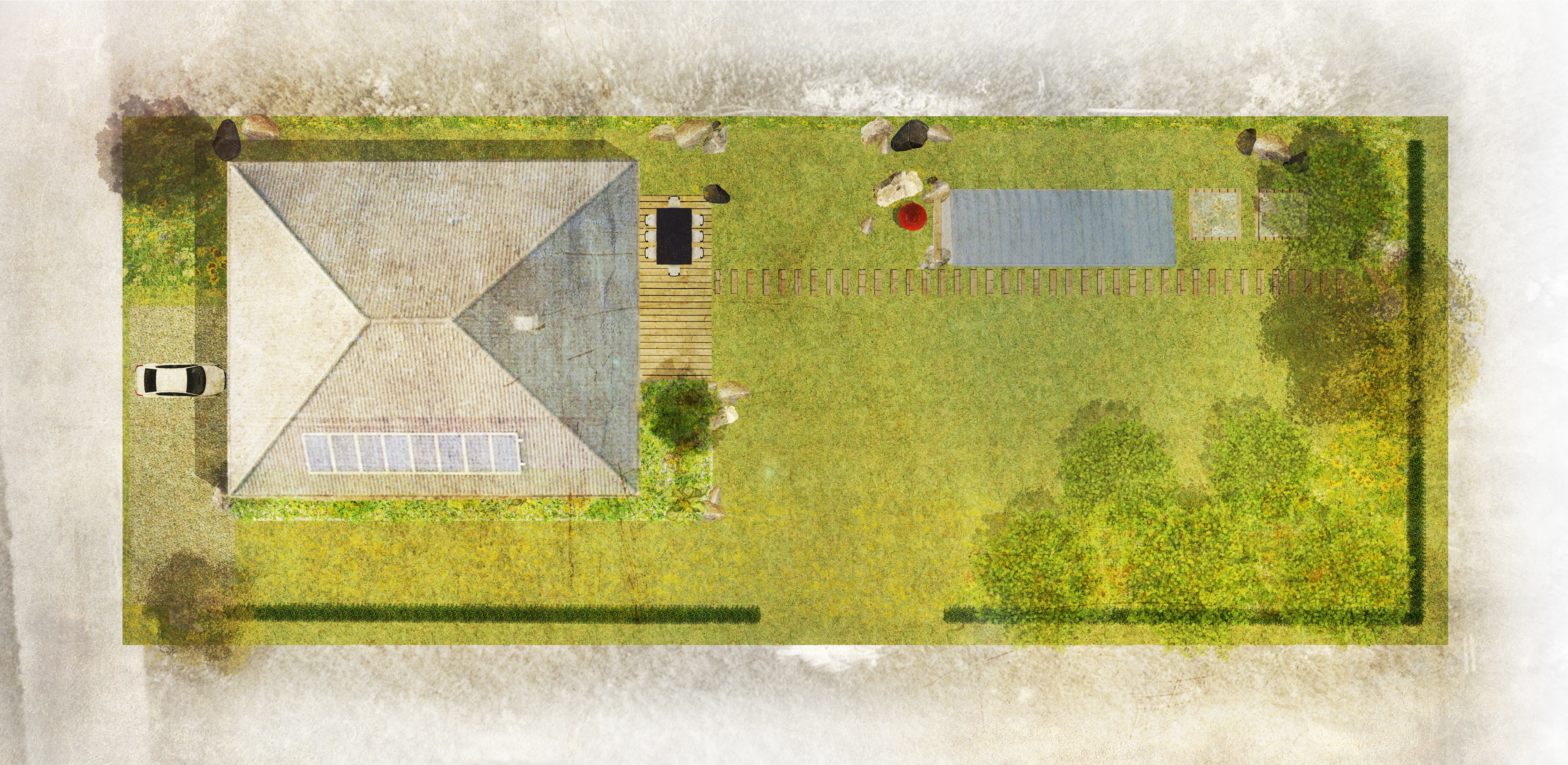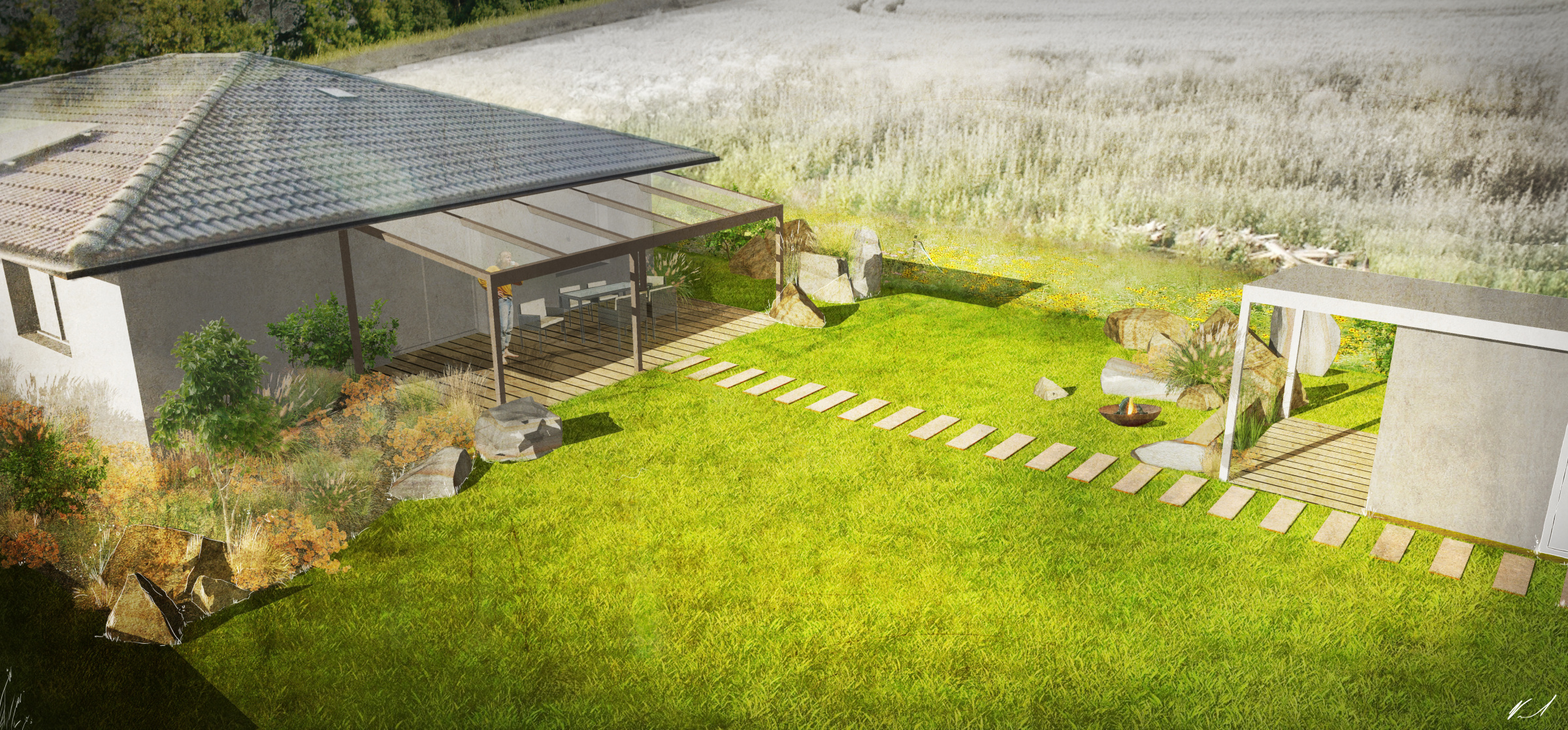Terasa ve východní části domu spolu s ohništěm tvoří centrální zónu. Zde je možné trávit čas v soukromí, zároveň zde ale pracujeme s výhledem dolů do krajiny, skrz mezeru v živém plotu.
