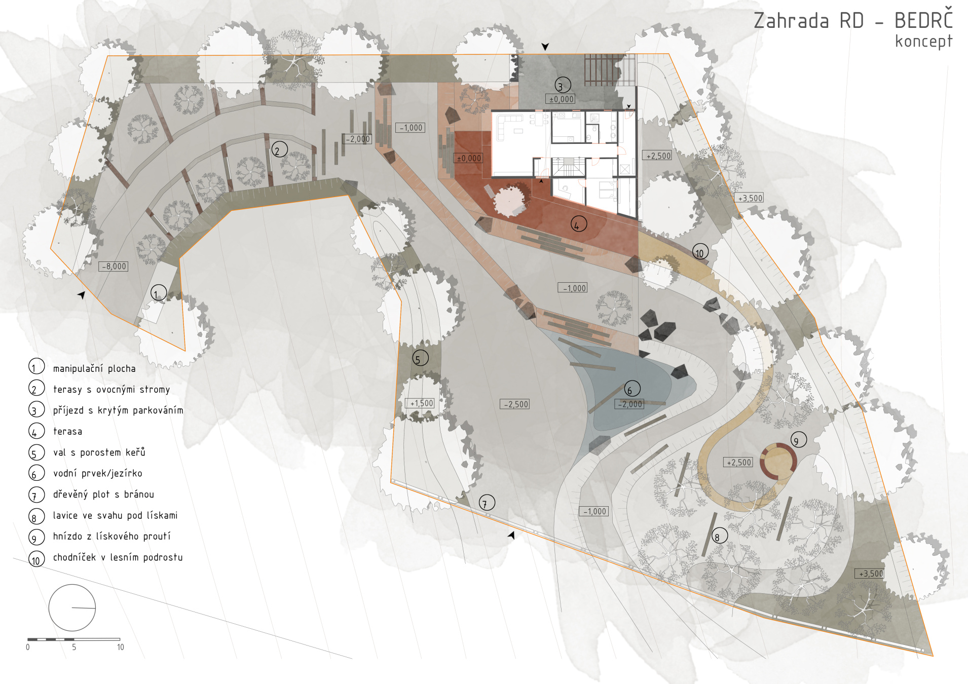 Rodinná zahrada v Bedrči je unikátním projektem a tím nejlepším příkladem ideálního postupu při tvorbě nového domova. Zákazník nás v tomto případě oslovil ve chvíli, kdy se na stavebním pozemku nenacházela ještě ani stavba ani výkopy, dokonce ve chvíli, kdy ještě koncept celého prostoru nebyl vůbec určen. Naším úkolem tak bylo tento koncept v prostoru vytvořit tak, aby dům, zahrada i okolní krajina byly neporušitelně provázány a dohromady utvářeli jeden harmonický celek. Kromě zahrady tak z pera našeho ateliéru vyšel i návrh domu, který majitele oslovil natolik, že se stal konečným konceptem.