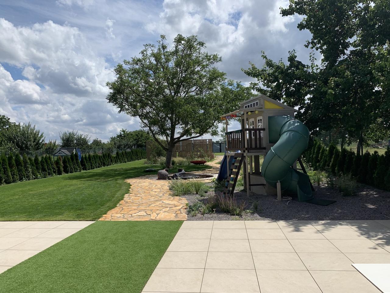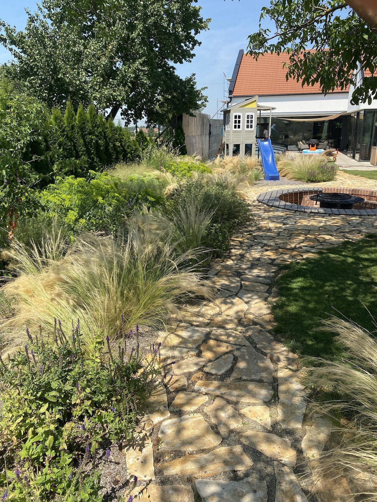 Projekt z pera Ateliéru Šteflovi a osvícený zákazník, který ví co chce a má jasno v tom, co od realizace čekat. Zahradu propojuje chodník z italského vápence a jednotná atmosféra.