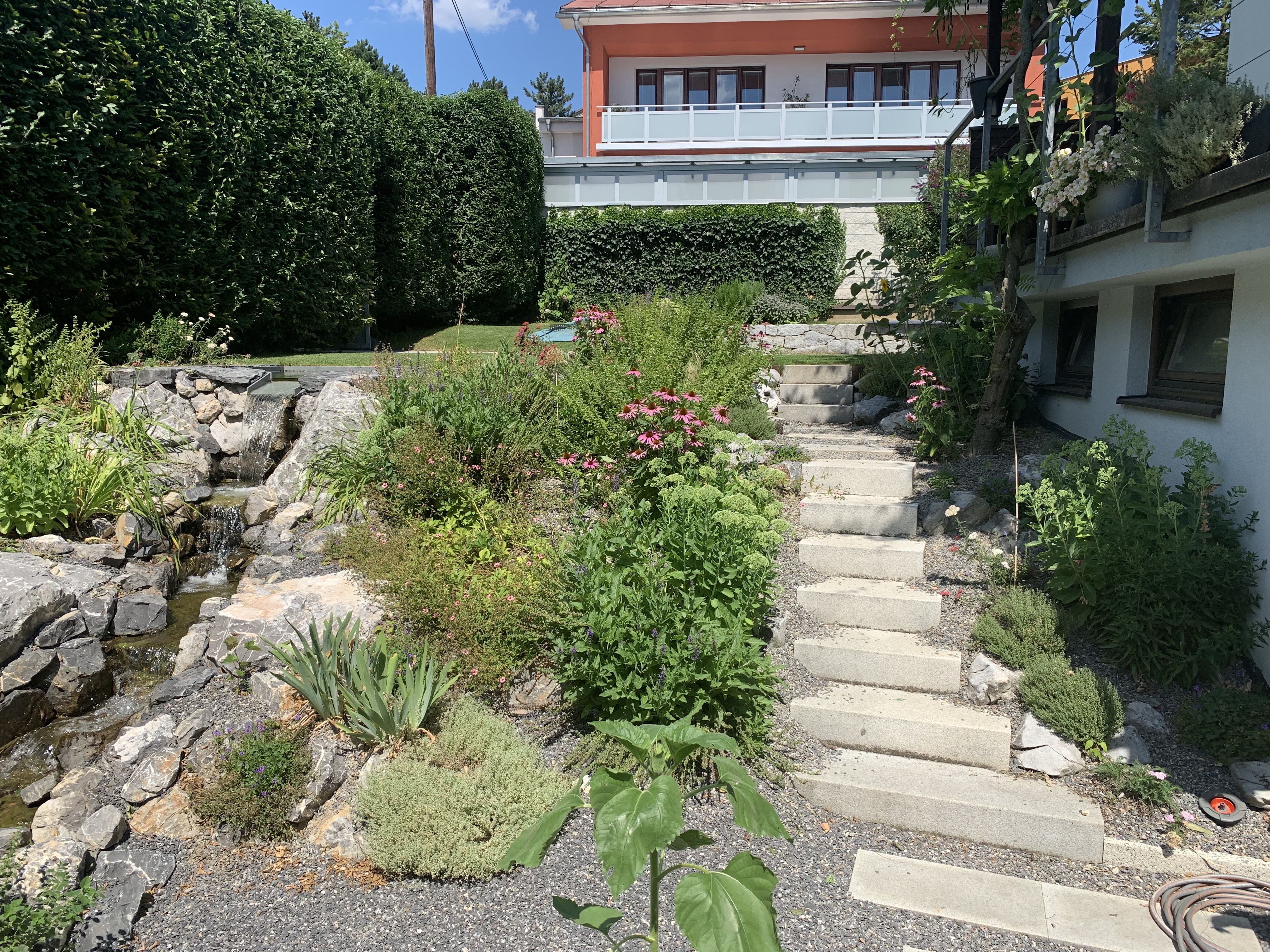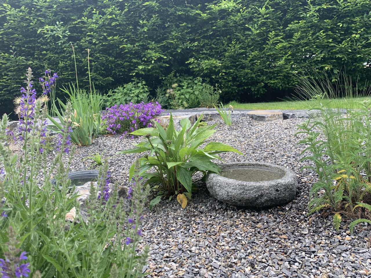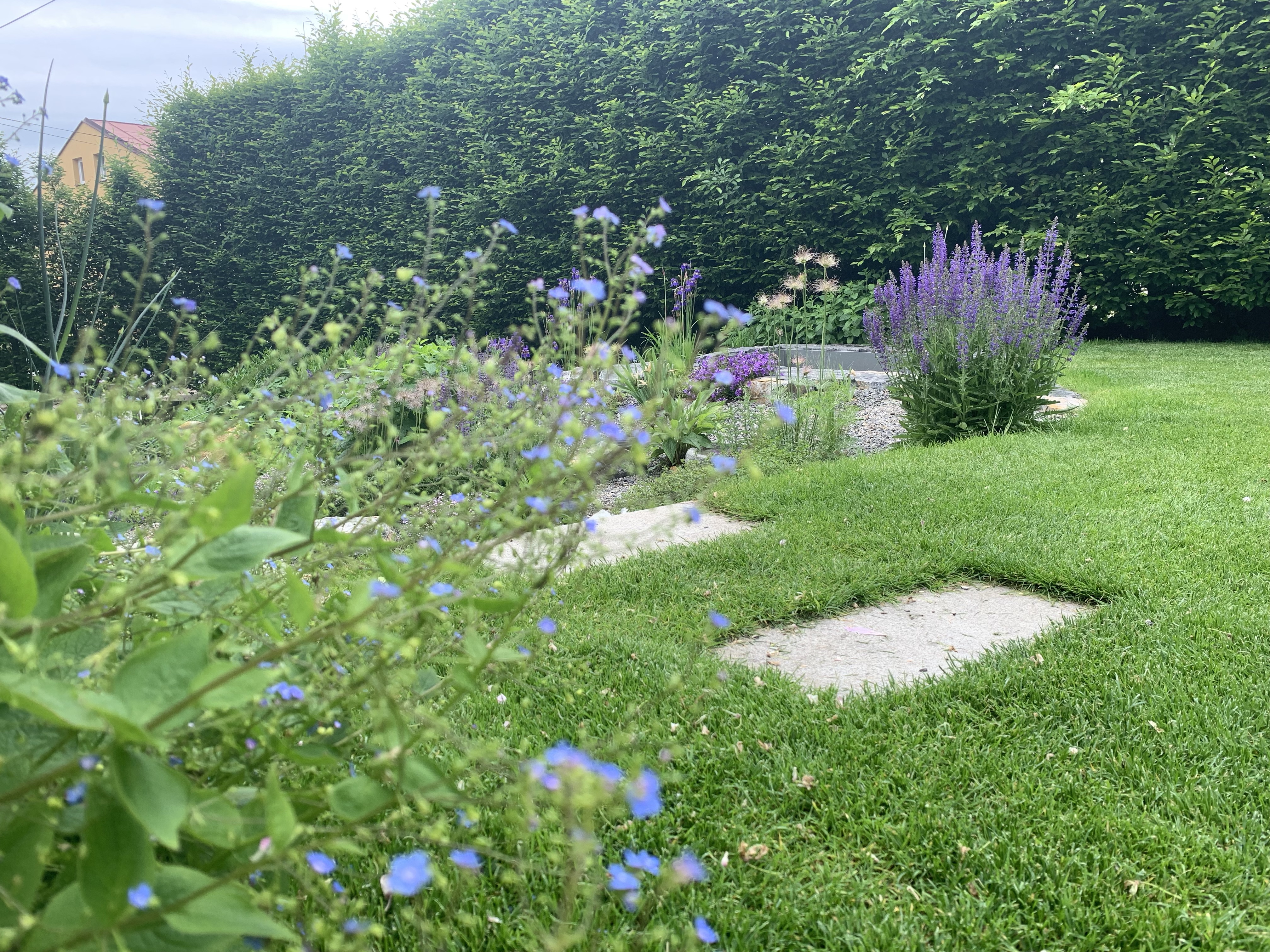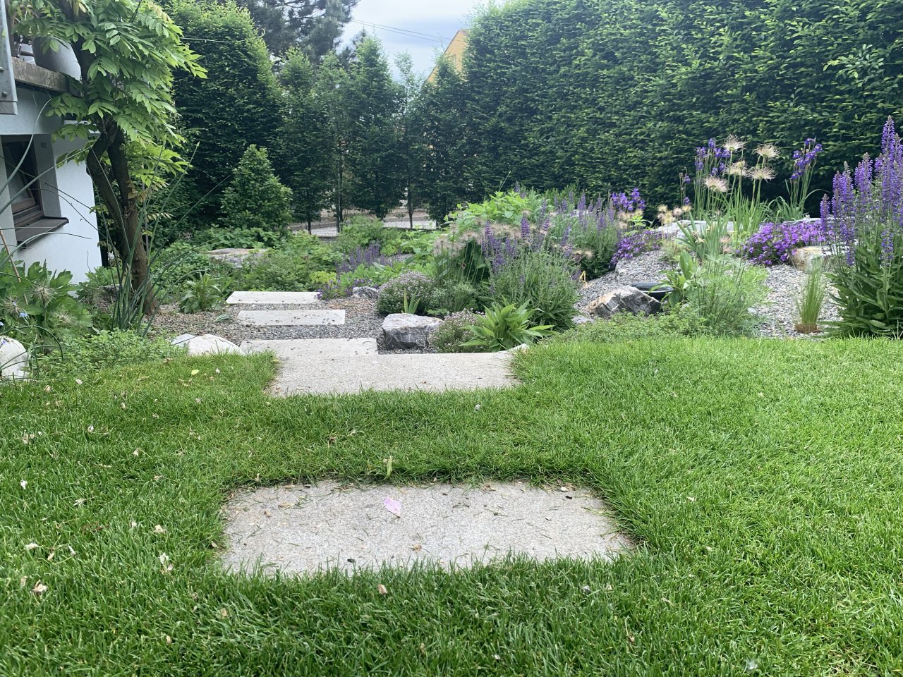 Chodníček a schody ze žulových šlapáků propojují zahradu s výše položenou travnatou částí. Do porostu břečťanu je zasazena dřevěná lavička a podél stěny vznikl záhon bylinek. Záhon doplňují pítka pro ptactvo.