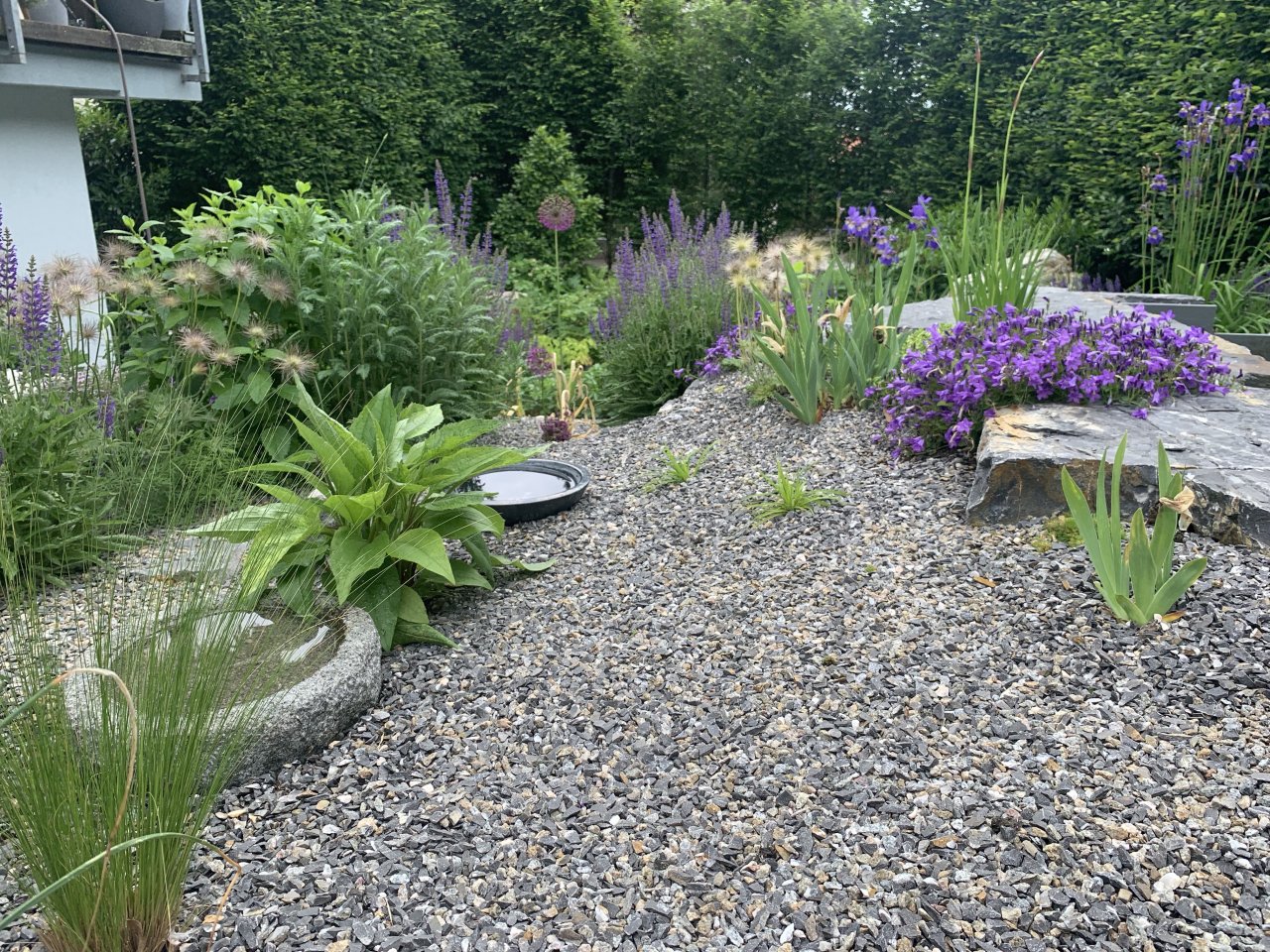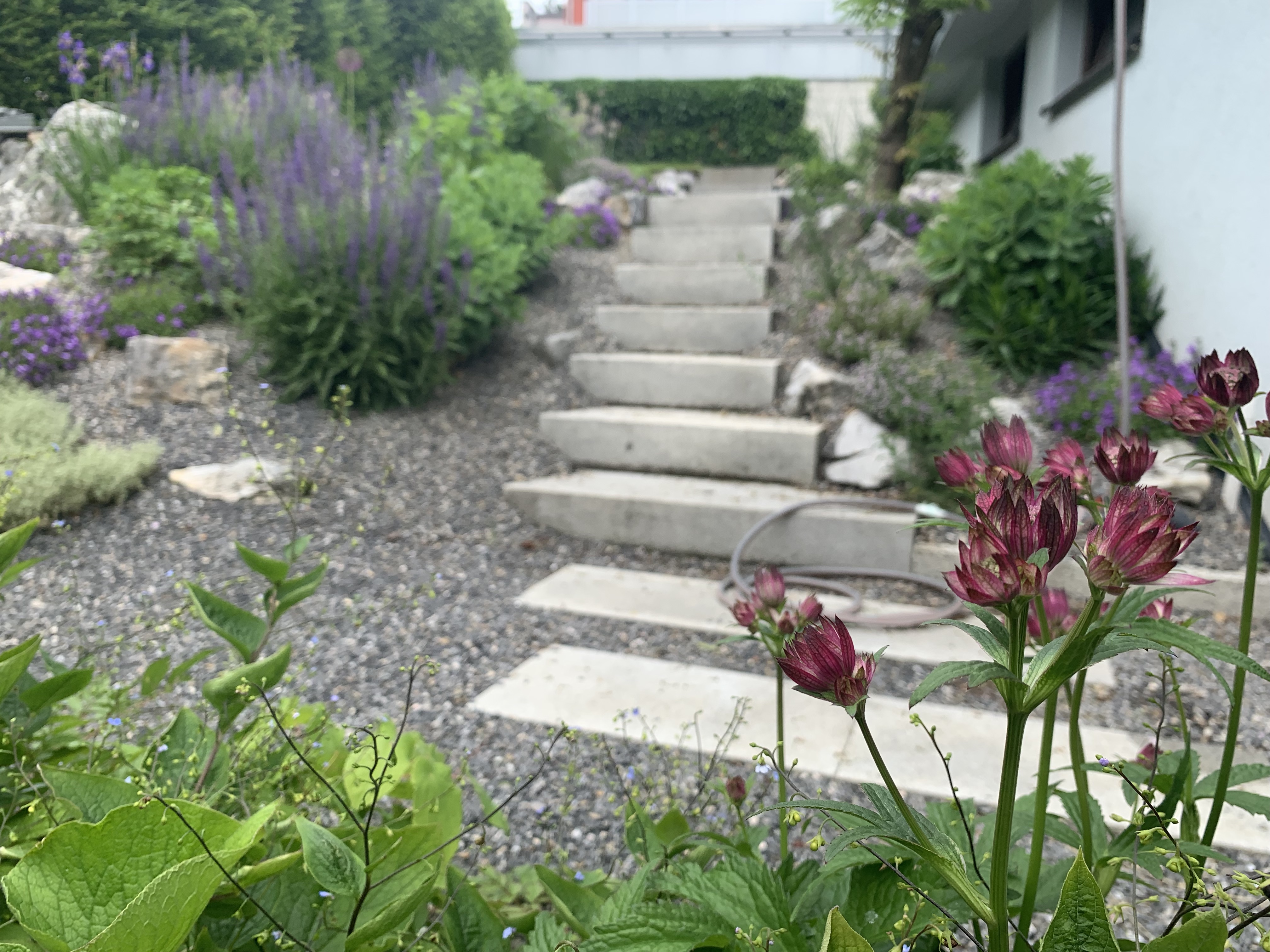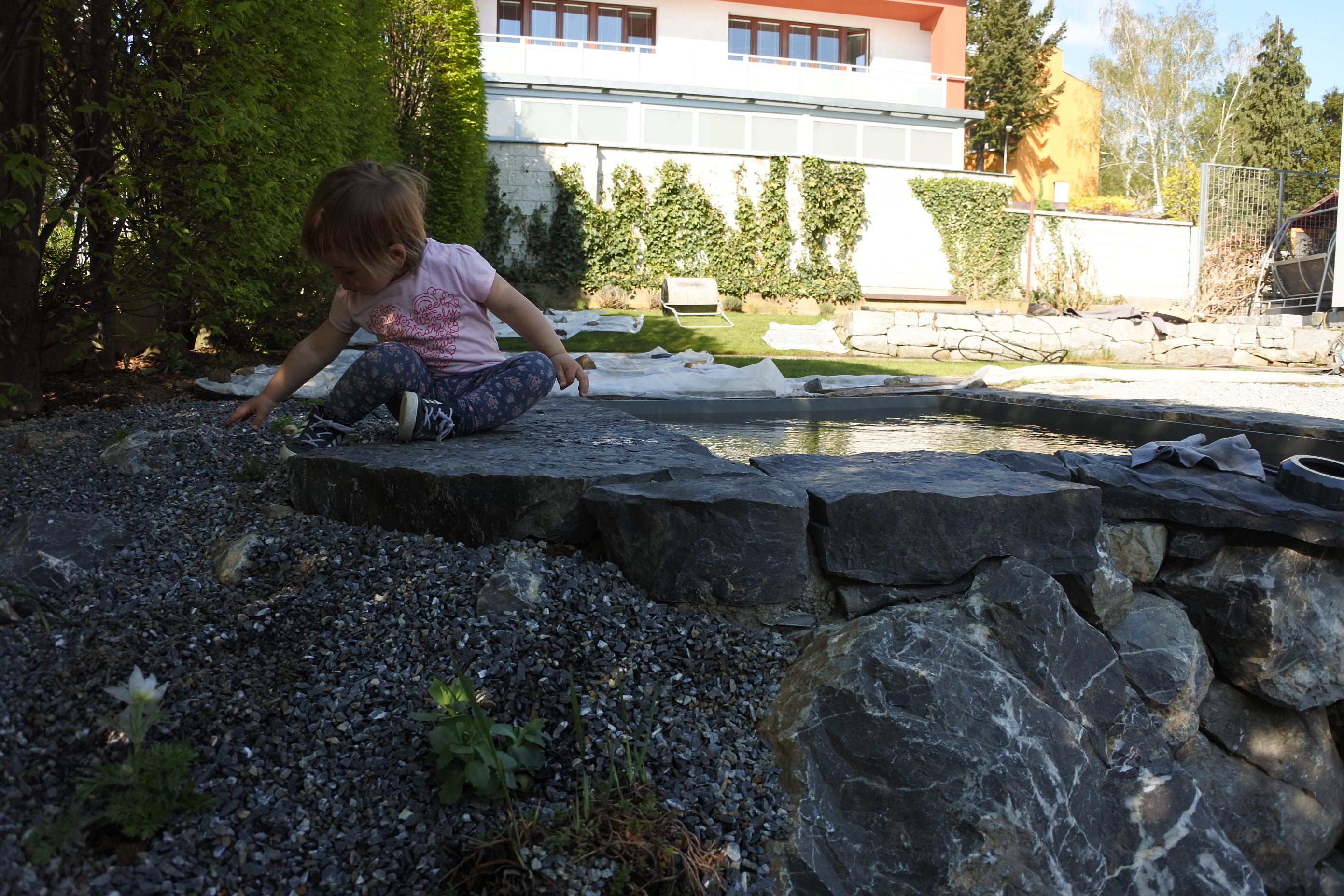 Chodníček a schody ze žulových šlapáků propojují zahradu s výše položenou travnatou částí. Do porostu břečťanu je zasazena dřevěná lavička a podél stěny vznikl záhon bylinek. Záhon doplňují pítka pro ptactvo.