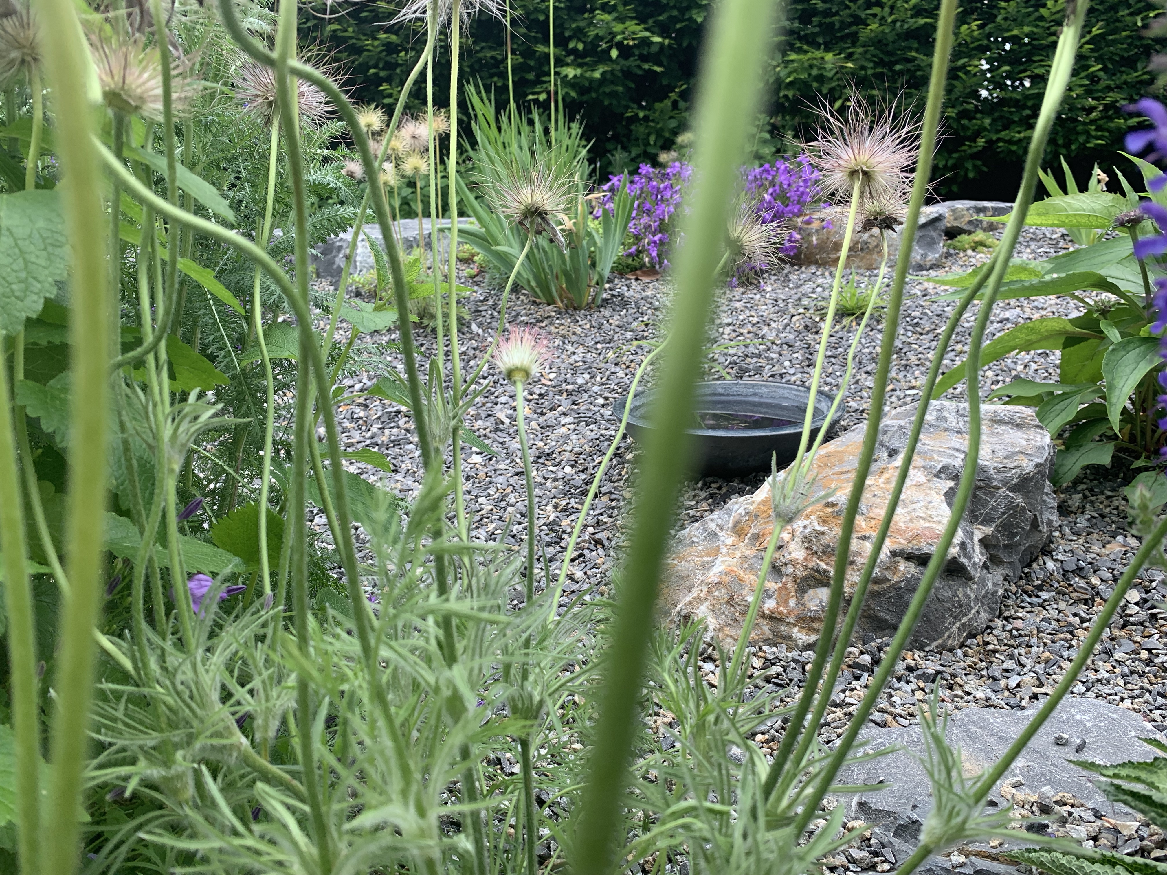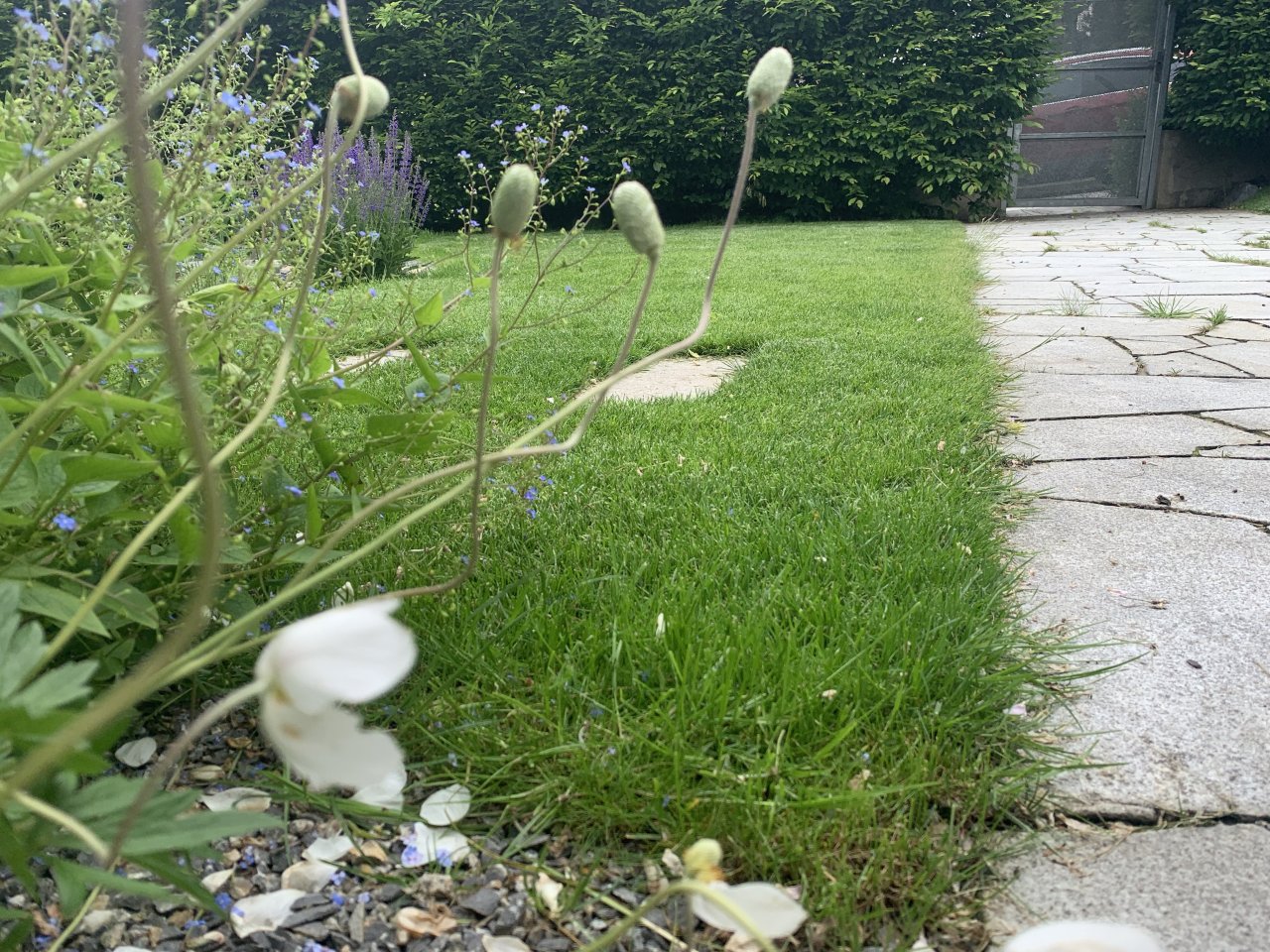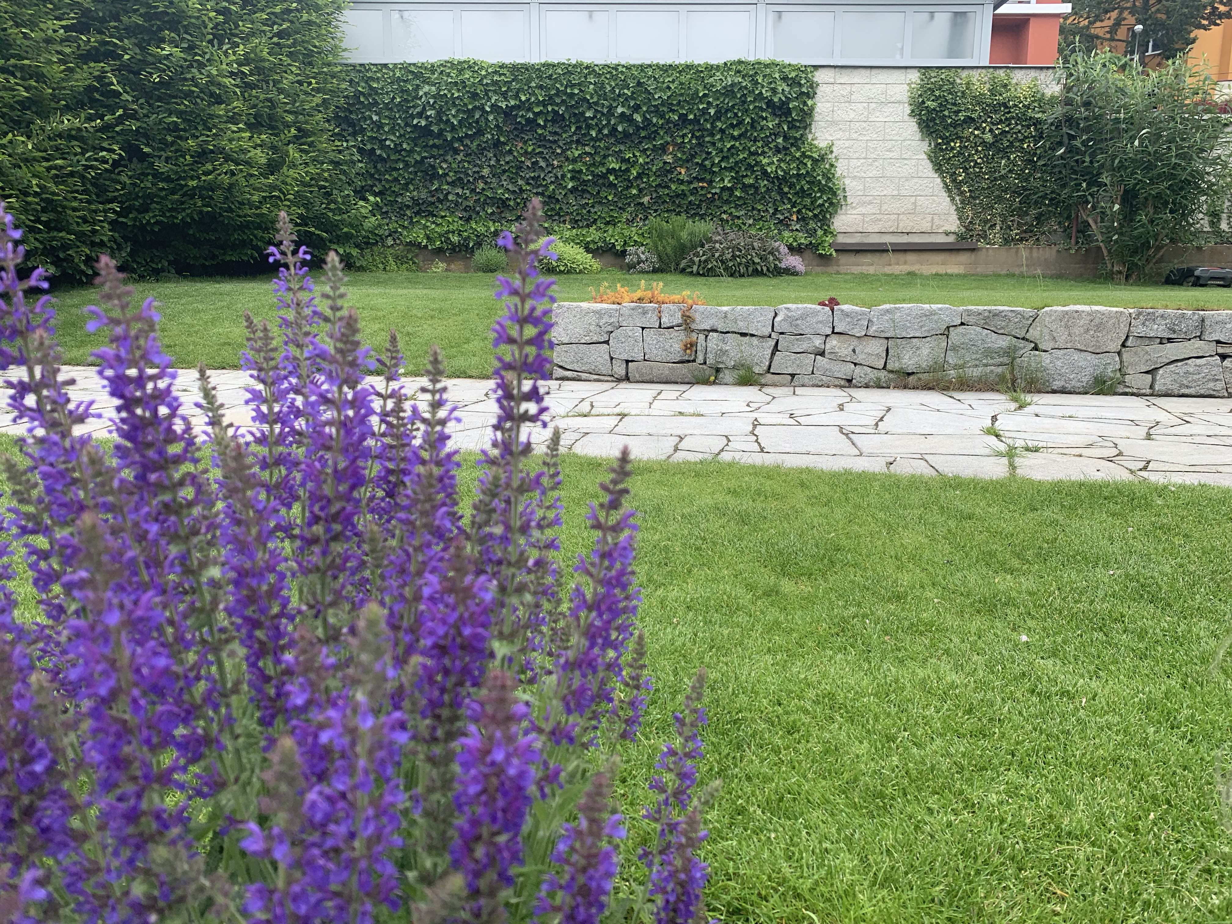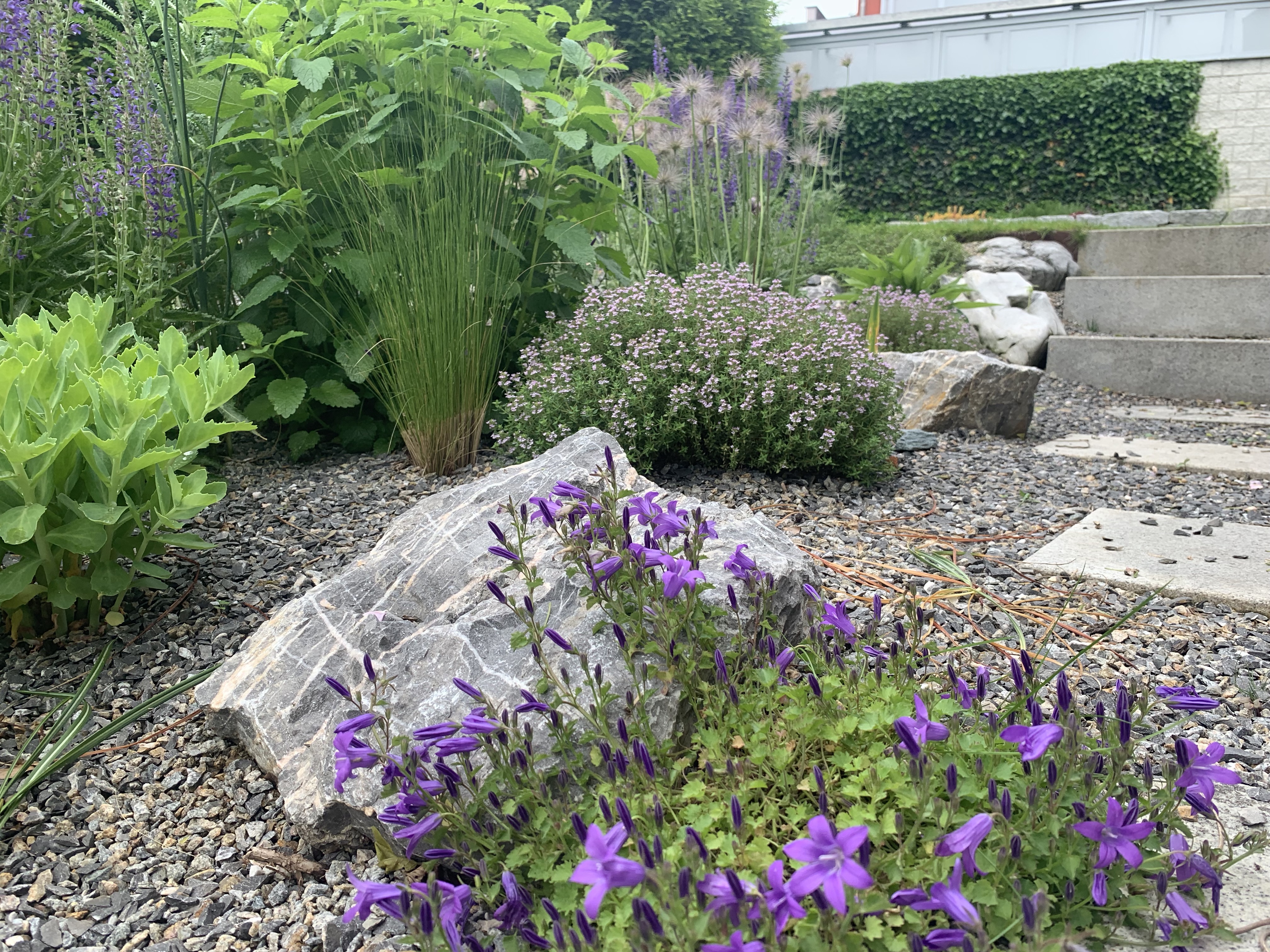 Chodníček a schody ze žulových šlapáků propojují zahradu s výše položenou travnatou částí. Do porostu břečťanu je zasazena dřevěná lavička a podél stěny vznikl záhon bylinek. Záhon doplňují pítka pro ptactvo.