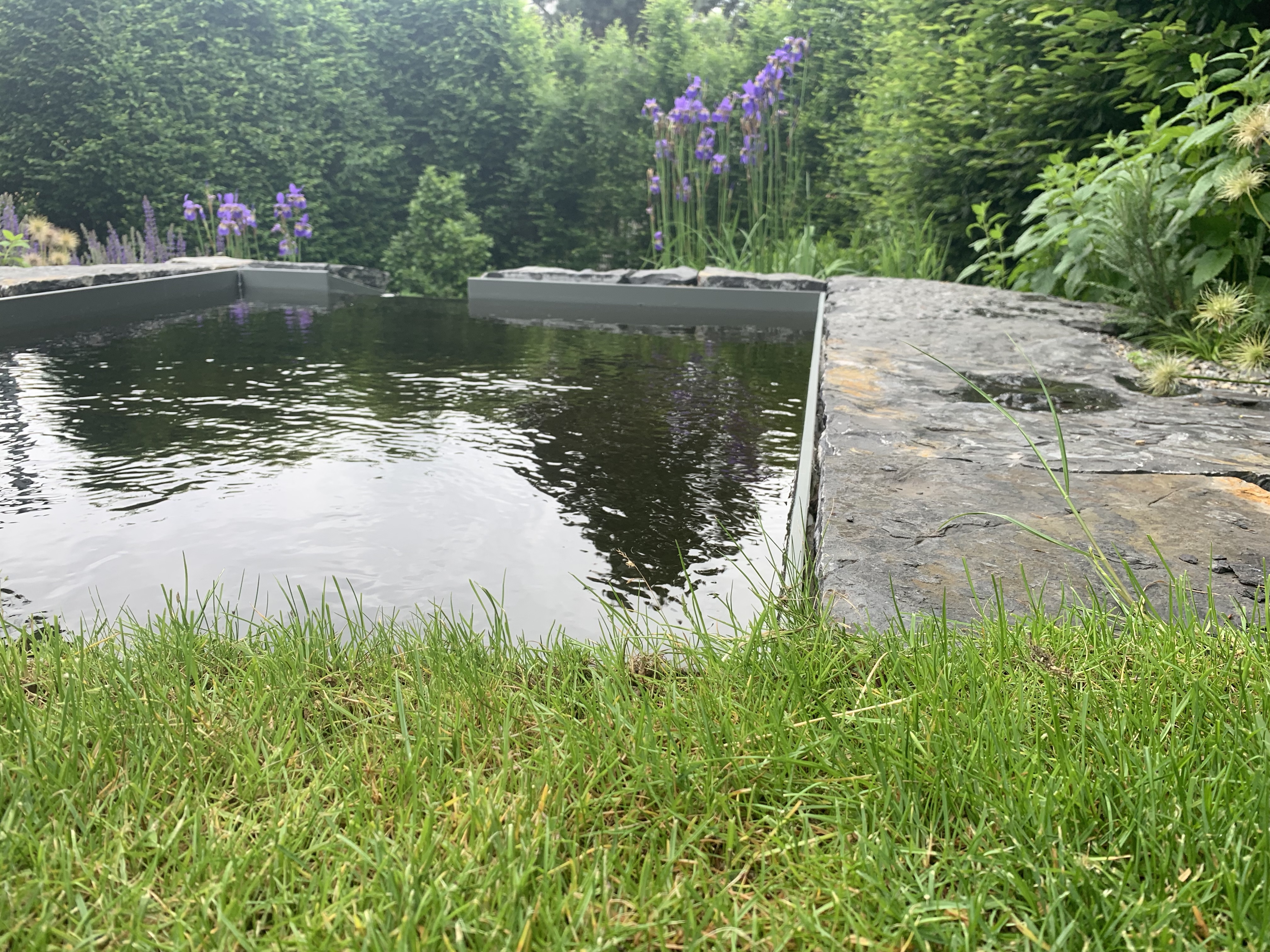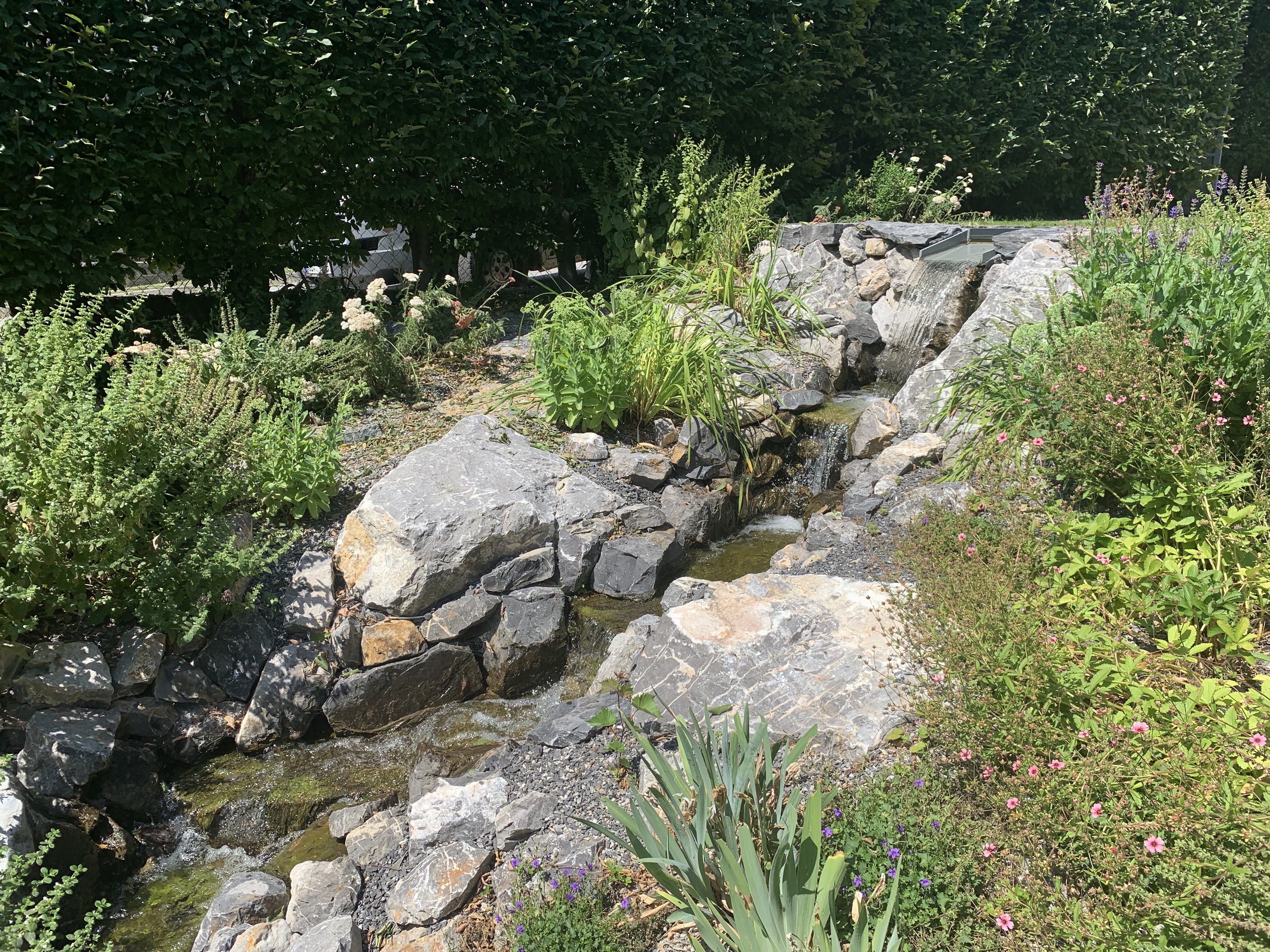 Hlavní myšlenkou je přenesení stylizované vodní kaskády z vápencových kamenů mezi kterými se voda ztrácí do „podzemí“. Koncept navazuje na původní uspořádání, dodává zahradě život a zvuk v podobě zurčící vody, barvy a vůni v podobě rostlin, a stín v podobě stromů.