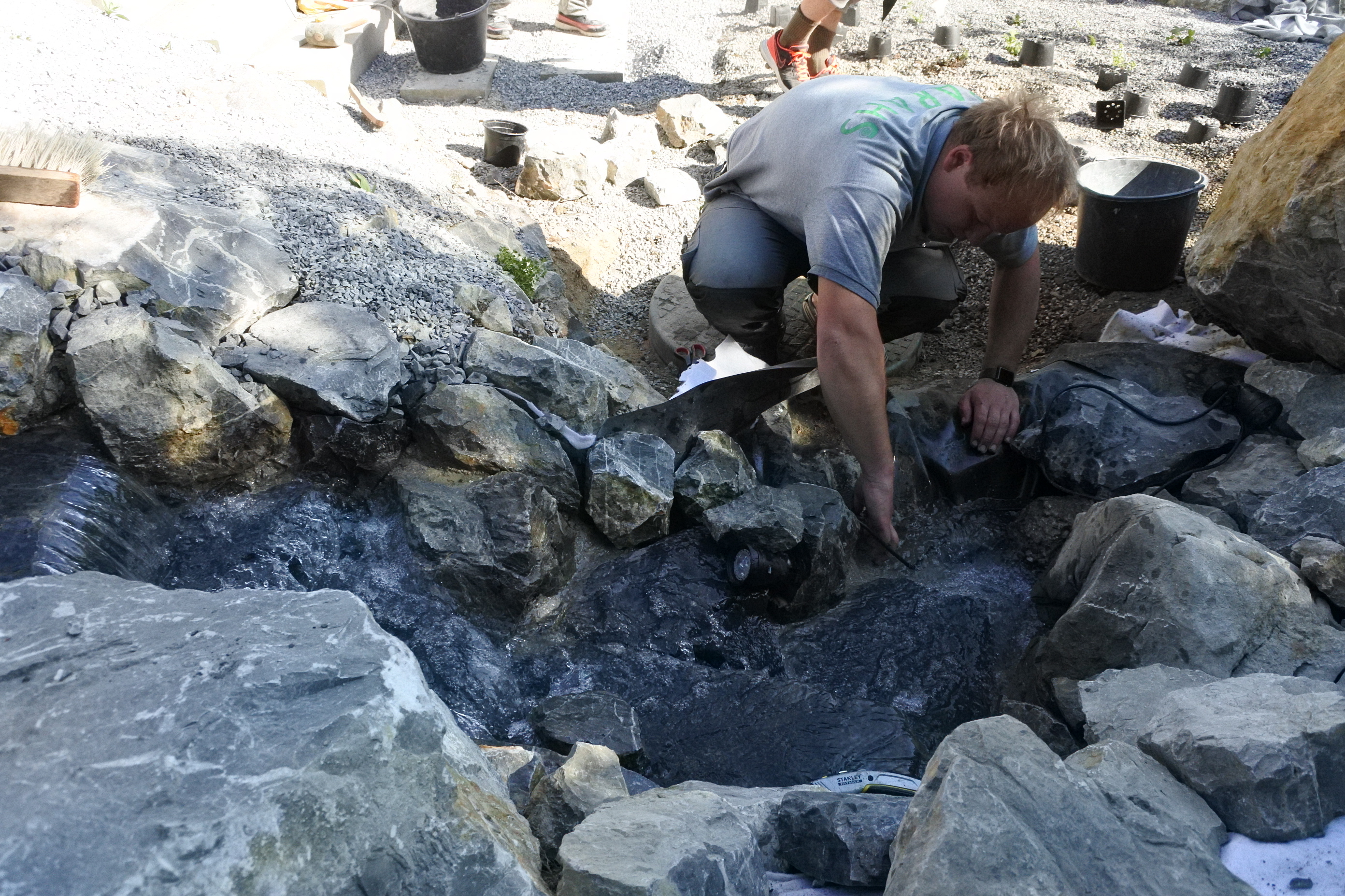 Vodní kaskáda překonává výškový rozdíl pomocí přepadů, vápencové monolity a balvany přehrazují a zpomalují padání vody. V nejvyšším bodu kaskády je umístěna menší nádrž obdélníkového tvaru. Svah je osázený trvalkami a keři v barvě žluté, fialové a modré. Rostliny svým náhodným uspořádáním připomínají stepní porost a postupně přechází do štěrkové plochy.